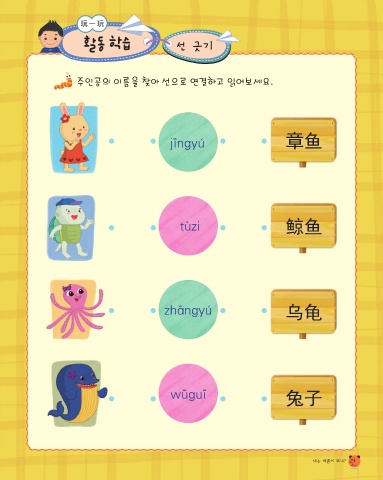 친구들의 얼굴과 이름을 찾아 스티커를 붙이고 대화해보세요.   주인공의 이름을 찾아 선으로 연결하고 읽어보세요.