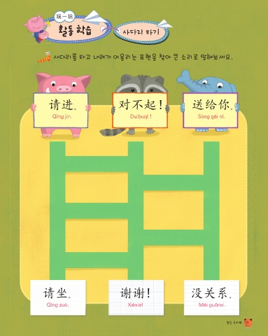 그림을 보고 빈칸에 들어갈 인사말을 골라 스티커를 붙이세요.     사다리를 타고 내려가 어울리는 표현을 찾아 큰 소리로 말해보세요.