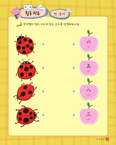 玩一玩 贴一贴 झ౭ழܳ 활동 학습 ࠢৈਃ 활동 학습 ࢶ Ӛӝ 케이크에 자신의 나이만큼 초 스티커를 붙이고 친구와 대화해보세요. 무당벌레 점의 개수와 맞는 숫자를 연결해보세요. 我 我____岁 。 ____岁____岁____岁 我 我 Wǒ ____ suì. 六 Wǒ ____ suì. Wǒ ____ suì. liù 你几岁? Nǐ jǐ suì? 五 wǔ 八 bā 三 sān 68 68 판판 어린이 중국어 너는 몇 살이야? 69 68 판판 어린이 중국어